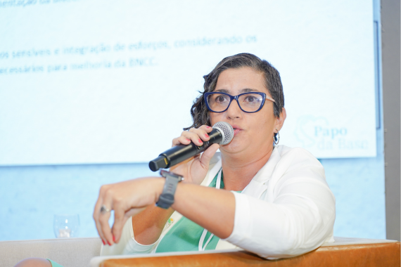 Giselle Pereira Campos Faria, vice-presidente da região Centro-Oeste do Consec, durante o Papo da Base 2025, reforçando a relevância da colaboração entre estados e da troca entre redes para fortalecer a implementação da BNCC.